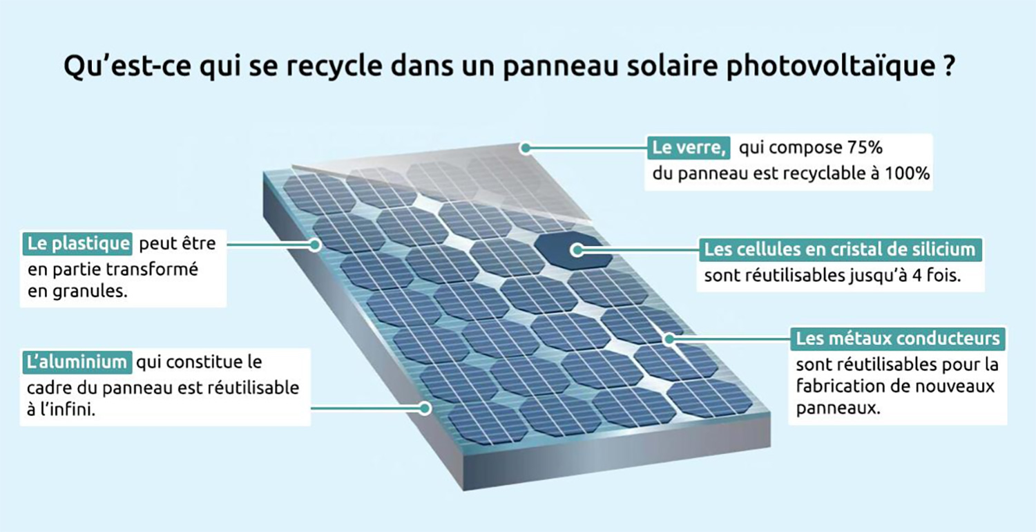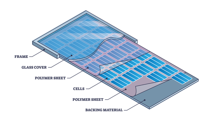 Les panneaux solaires sont composés de petites unités, appelées cellules photovoltaïques, généralement fabriquées à base de Silicium, un matériau semi-conducteur.