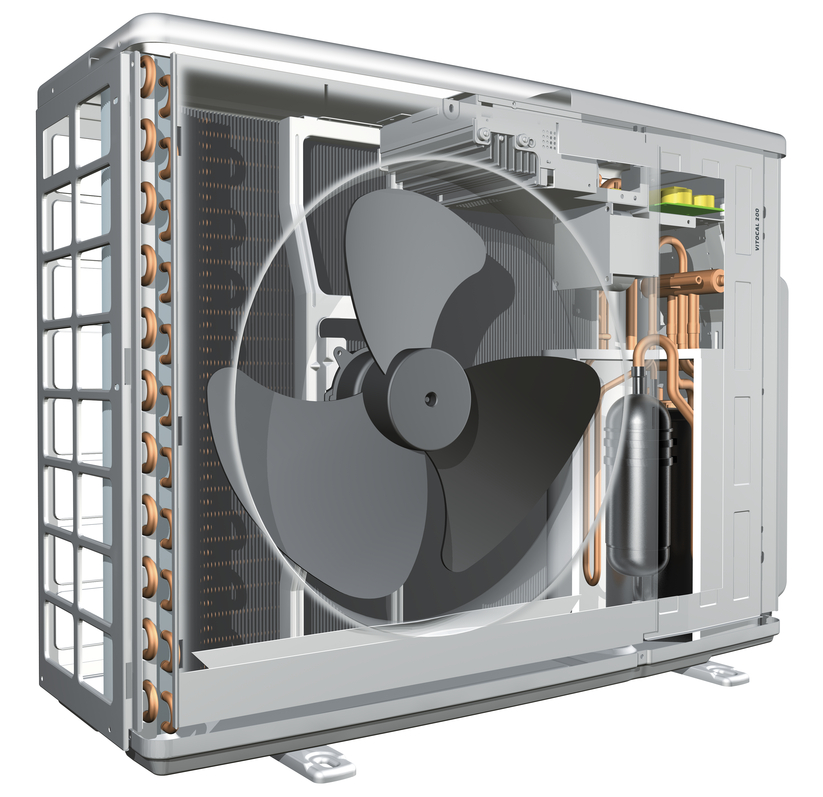 - Le condenseur transfère cette chaleur au circuit de chauffage de la maison (radiateurs, plancher chauffant, ballon d’eau chaude).